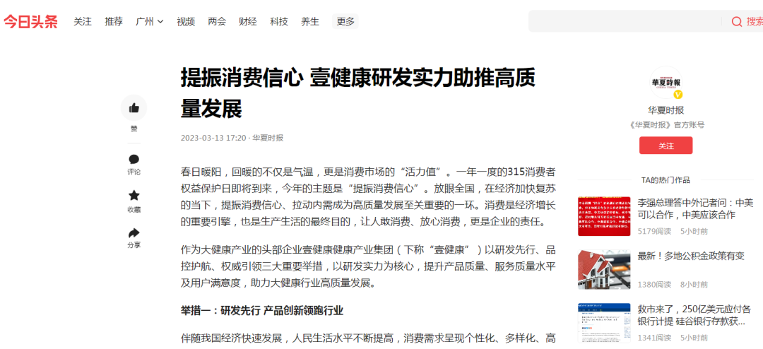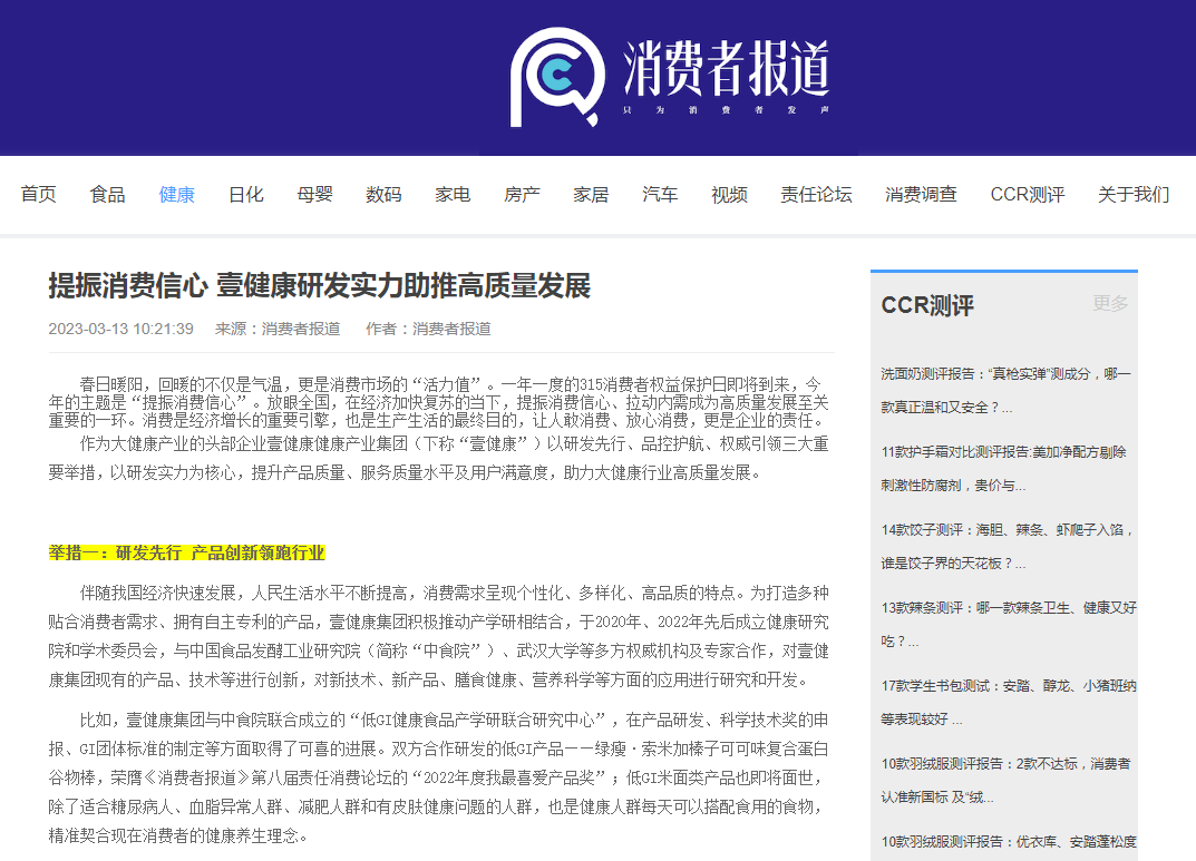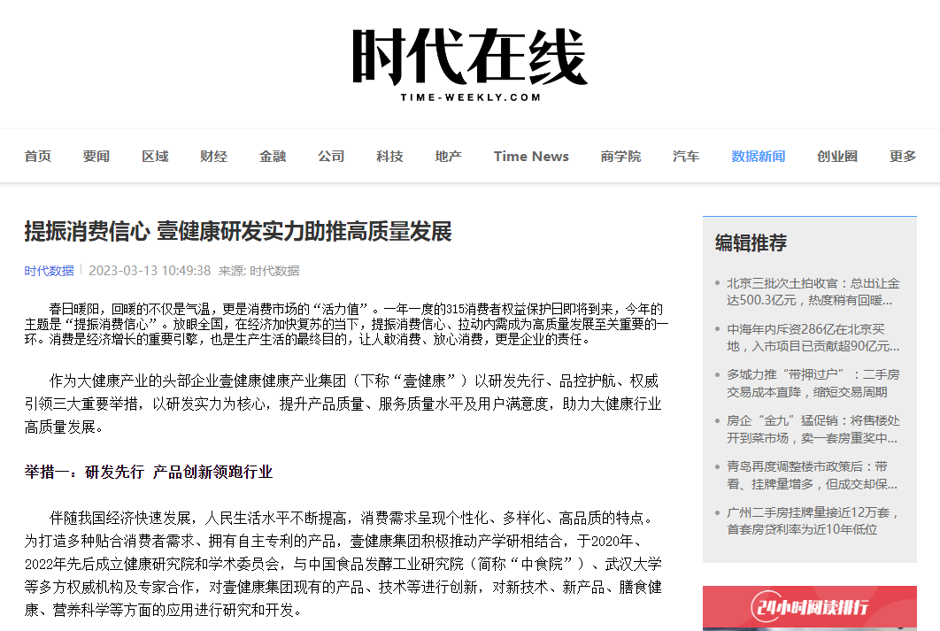 作為大健康行業(yè)頭部企業(yè)的壹健康集團(tuán),一直以來堅(jiān)持產(chǎn)品創(chuàng)新與質(zhì)量?jī)墒肿ィ岣呦M(fèi)者的滿意度和獲得感,在更好滿足消費(fèi)者不斷升級(jí)的個(gè)性化、定制化需求的同時(shí),也讓消費(fèi)者敢消費(fèi)、放心消費(fèi),獲得中央級(jí)媒體《華夏時(shí)報(bào)》、權(quán)威媒體《時(shí)代周報(bào)》、《消費(fèi)者報(bào)道》、新浪新聞、今日頭條等十多家權(quán)威媒體認(rèn)可。其中,《華夏時(shí)報(bào)》報(bào)道的《提振消費(fèi)信心 壹健康研發(fā)實(shí)力助推高質(zhì)量發(fā)展》,被眾多權(quán)威媒體轉(zhuǎn)發(fā),受到行業(yè)關(guān)注和好評(píng)!